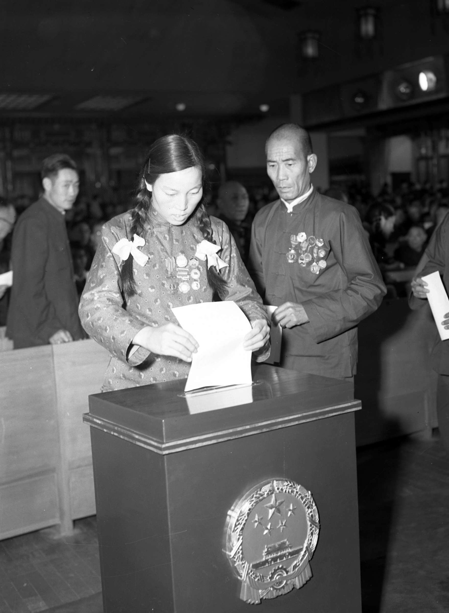 1954年9月,中华人民共和国第一届全国人民代表大会第一次会议用无记名方式投票选举中华人民共和国主席、副主席,全国人民代表大会常务委员会委员长、副委员长、秘书长和委员,最高人民法院院长,最高人民检察院检察长,并通过国务院总理人选。图为申纪兰在投票。 新华社记者 曹兴华/摄