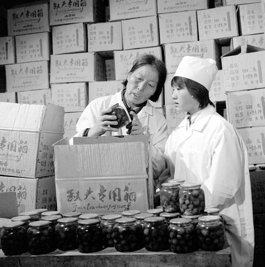申纪兰带领群众脱贫致富,1986年9月与县供销社联合办起一座罐头厂,投产后的第一个月就生产红果、梨罐头5万多瓶。这是申纪兰(左)和工人一起检查罐头质量(资料照片)。新华社发