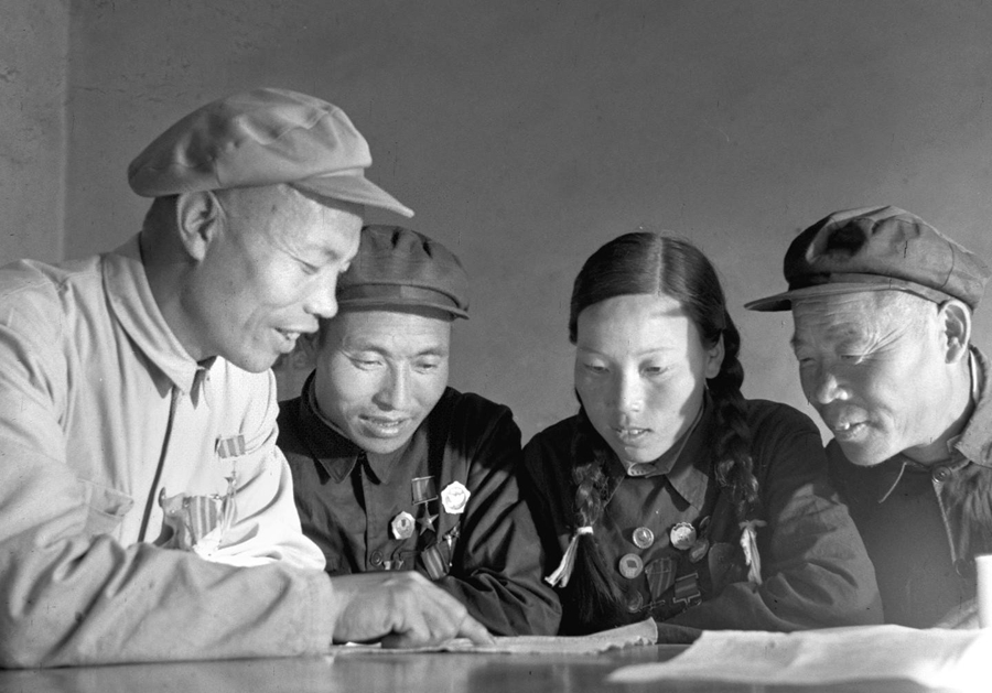 1954年7月,出席山西省平顺县第一届第一次人民代表大会会议的代表们,以欢欣的心情,讨论中华人民共和国宪法草案。自左至右:李顺达、郭玉恩、申纪兰、武侯梨。新华社发