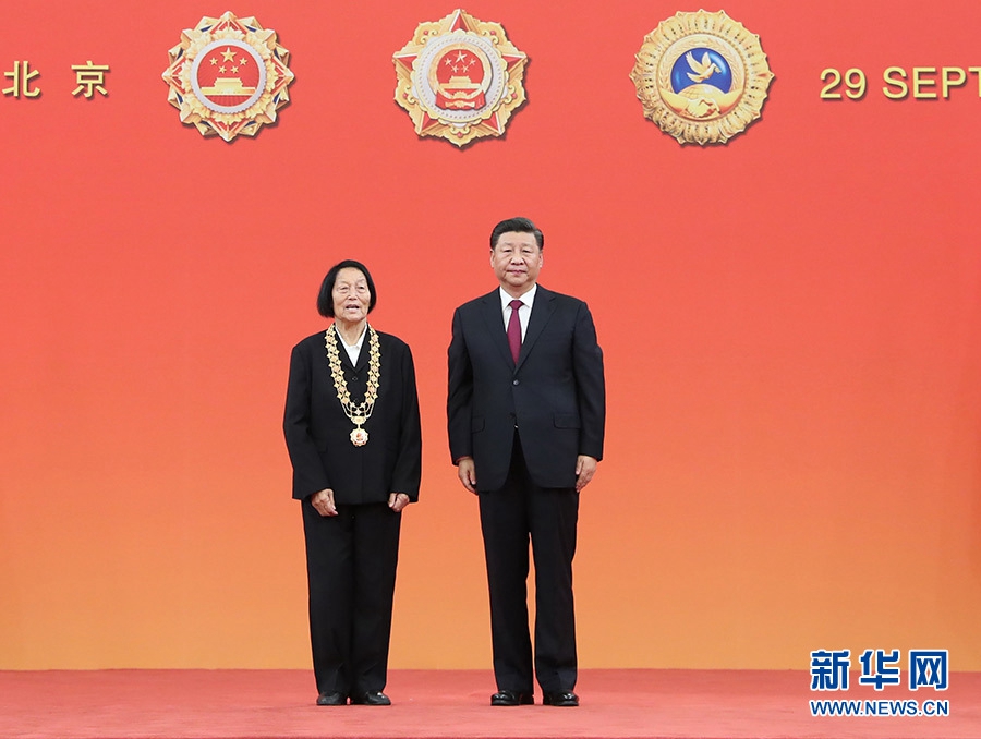 2019年9月29日,中华人民共和国国家勋章和国家荣誉称号颁授仪式在北京人民大会堂金色大厅隆重举行。中共中央总书记、国家主席、中央军委主席习近平向“共和国勋章”获得者申纪兰颁授勋章。 新华社记者 王晔/摄