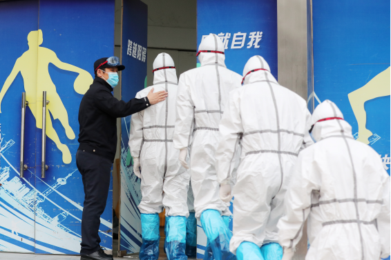 2020年2月13日,全国公安一级英模、武汉市公安局江岸区分局刑侦大队教导员许奎(左一)率领10名突击队员,列队进入刚启用的武汉全民健身中心方舱医院。 新华社发