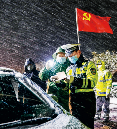 新冠肺炎疫情发生后,安徽省合肥市庐江县公安、交通、医疗卫生等部门联手作战,严把车辆人员入口关。图为2020年2月15日夜,公安民警冒着严寒在风雪黑夜里坚守疫情防控岗位,甘做人民群众的安全“守夜人”。中新社 左学长/摄