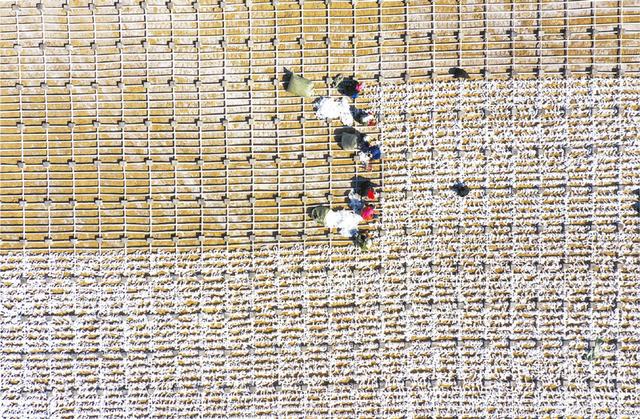 近年来,宁夏石嘴山市不断加强湖泊湿地生态环境综合治理,坚持以水生态修复为基础,以水质改善为核心,实施水系连通、水生植物种植、生态补水、岸线综合治理等项目,水体水质逐年改善,黄河流域生态持续向好。图为2020年4月16日,工人在宁夏石嘴山市星海湖湿地绑制用于改善水质的生物飘带(无人机照片)。 新华社记者 冯开华/摄
