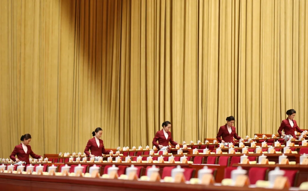图为2014年3月8日,全国政协十二届二次会议在北京人民大会堂举行第三次全体会议。这是工作人员在会议开始前倒水。