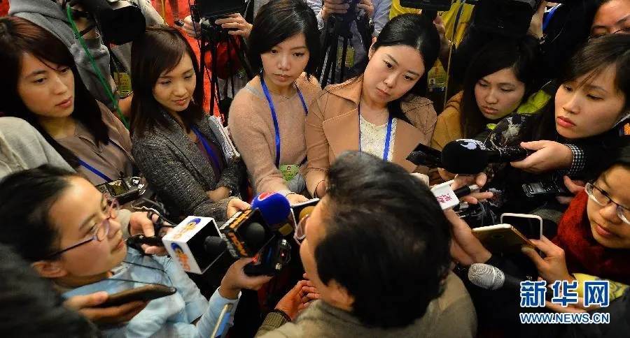 这是2015年3月7日,几名女记者在北京人民大会堂采访一位全国人大代表。