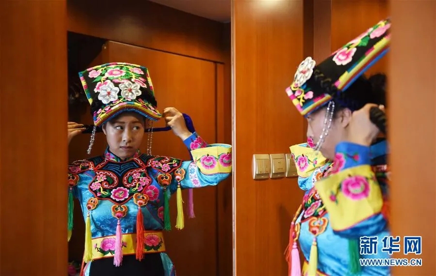 图为2016年3月8日,全国人大代表王安兰在房间里整理服装准备参加审议。