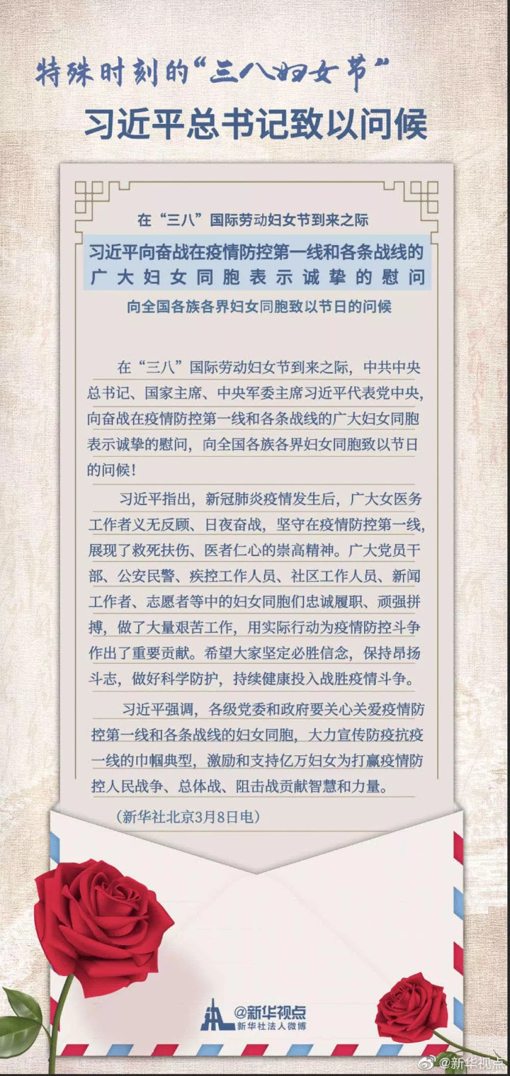 2020年是一个特别的年份。这一天,习近平总书记的问候和祝福依然如期而至。他代表党中央,向奋战在疫情防控第一线和各条战线的广大妇女同胞表示诚挚的慰问,向全国各族各界妇女同胞致以节日的问候!