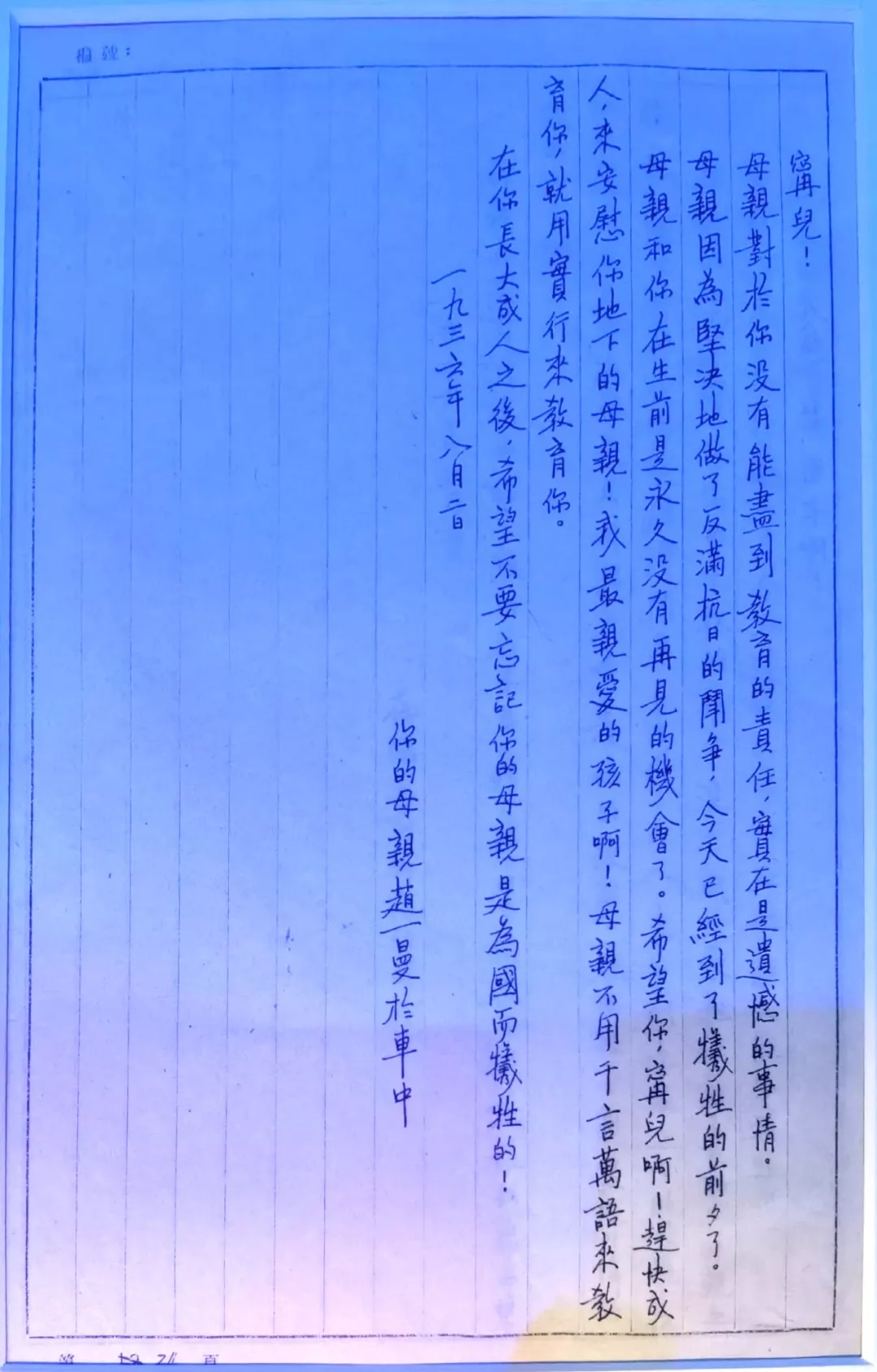 “在你长大成人之后,希望不要忘记你的母亲是为国而牺牲的!”这是赵一曼同志在牺牲前给儿子的遗书。她在抗日斗争中不幸被捕,1936年8月2日英勇就义。 求是记者 刘名美/摄