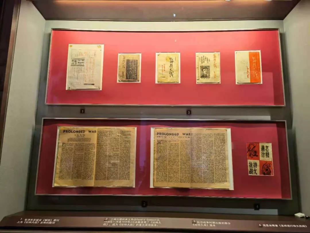 展柜中的陈列:毛泽东同志在延安《解放》周刊上为《论持久战》发表的题词;上海出版的英文杂志Candid Comment 从1938年11月至1939年2月连载发表了《论持久战》,成为《论持久战》的首次英译版本;抗日战争时期出版的部分《论持久战》版本;周恩来同志等著《怎样进行持久抗战》。 求是记者 刘名美/摄