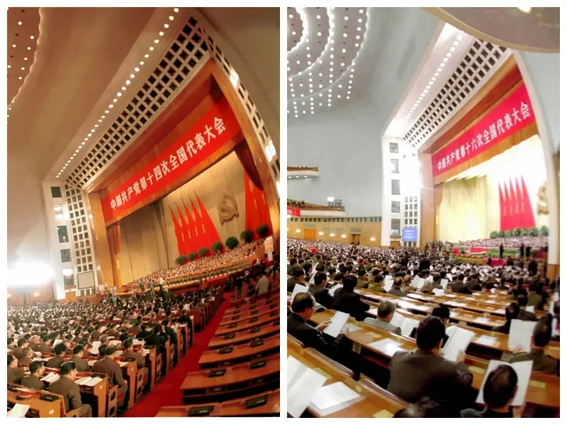 左图为1992年10月12日,中国共产党第十四次全国代表大会在北京人民大会堂隆重开幕。右图为2002年11月8日至14日,中国共产党第十六次全国代表大会在北京举行。 新华社发
