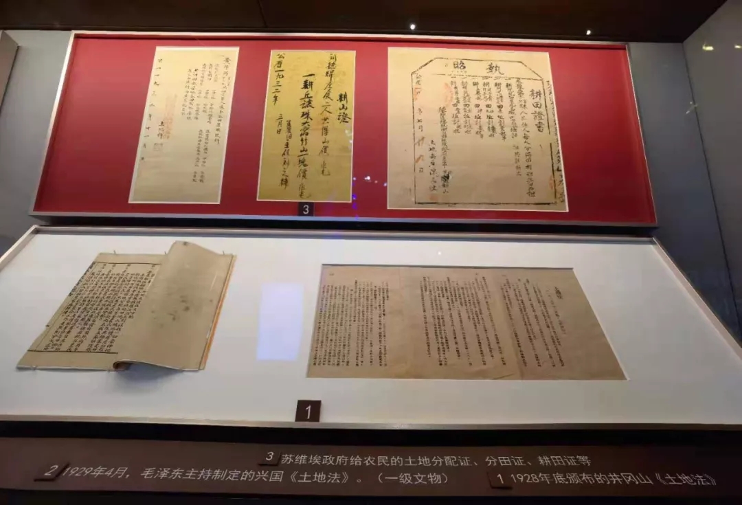 展柜中陈列的是:1928年底颁布的井冈山《土地法》;1929年4月,毛泽东同志主持制定的兴国《土地法》;苏维埃政府给农民的土地分配证、分田证、耕田证等。 求是记者 刘名美/摄