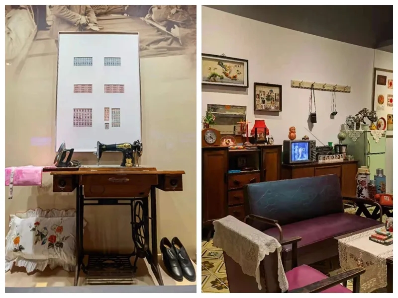 左图为20世纪70、80年代有关“穿”的购物票证,右图为展览中复原的具有“年代感”的生活场景。 求是记者 刘名美/摄