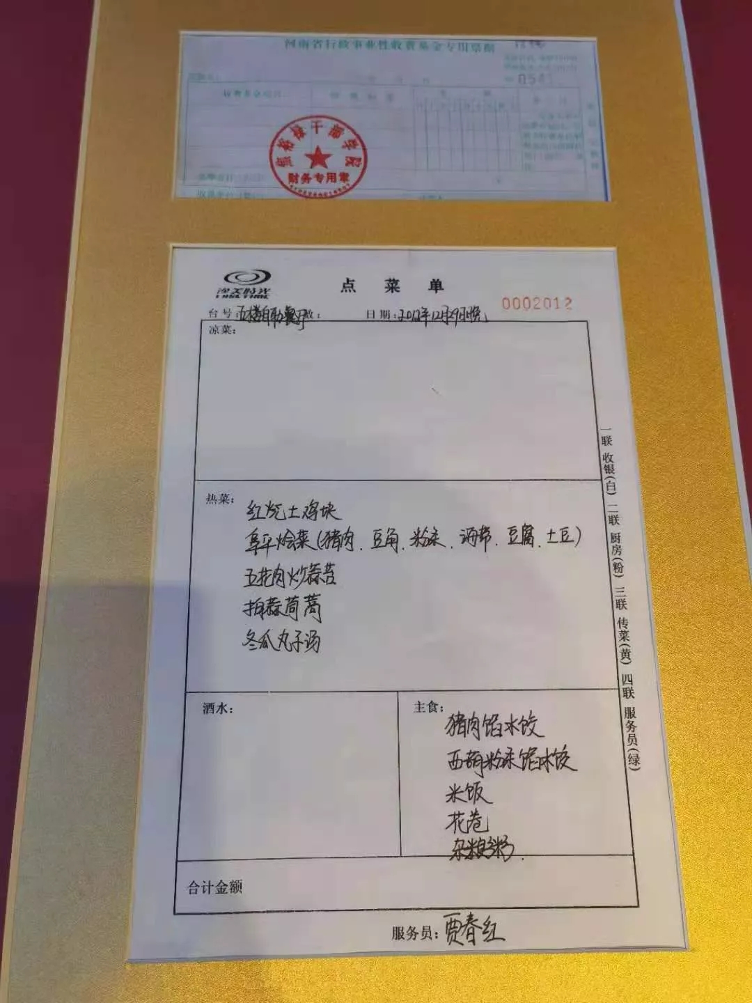 图中上面的票据是,2014年3月18日,习近平总书记考察河南省兰考县时在焦裕禄干部学院缴纳伙食费的票据;下面的单子是,2012年12月29日,习近平总书记在河北省阜平县招待所用餐时的点菜单,“红烧土鸡块、阜平烩菜、五花肉炒蒜苔、拍蒜茼蒿、冬瓜丸子汤”,都是普通的家常菜。 求是记者 刘名美/摄