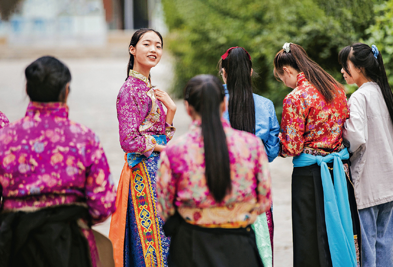 2020年8月6日,青海门源回族自治县珠固乡东旭村,村民们身着盛装准备去表演锅庄舞。 中国文联供图 费茂华/摄