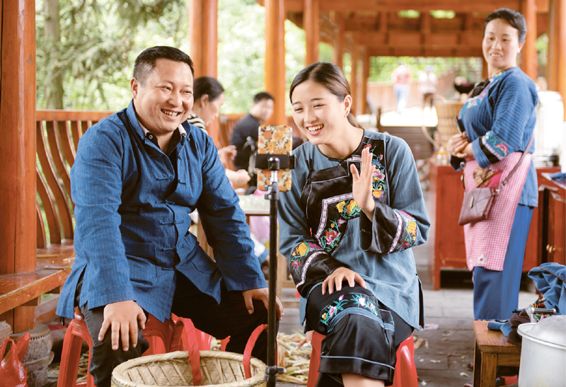 图为2020年5月15日,湖南省十八洞村第三任驻村扶贫工作队队长麻辉煌(左)与返乡大学生施林娇一起通过网络直播推销土特产。 新华社发 陈思汗/摄