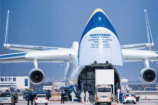 疫情发生以来,中国发起了新中国成立以来规模最大的全球人道主义行动,有力支持全球疫情防控。图为2020年4月13日,全球最大运输机AN225在天津滨海国际机场装载国际防疫物资。 中新社记者 佟郁/摄