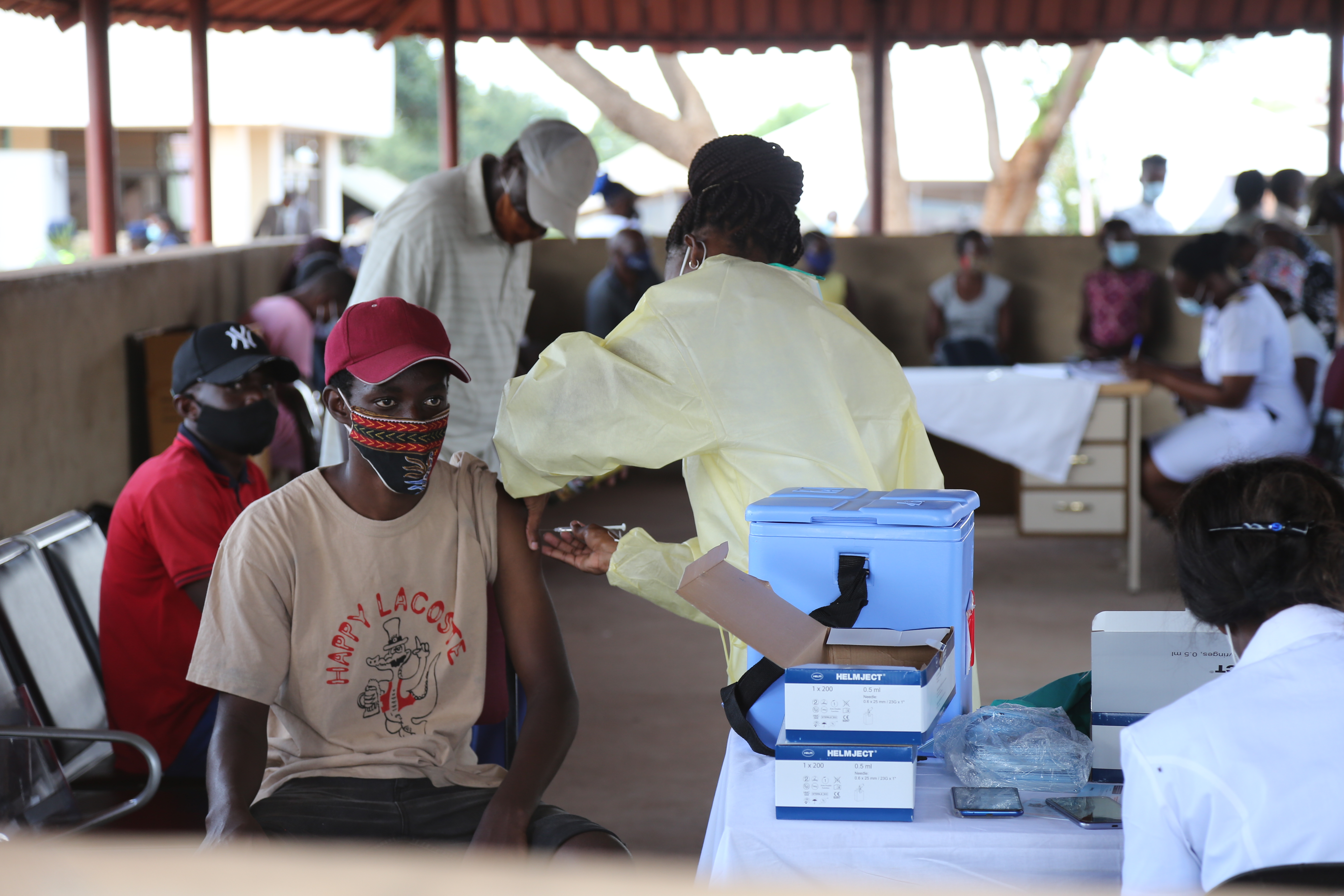 津巴布韦维多利亚瀑布城的居民大规模接种了中国国药集团新冠疫苗,这座城市成为津巴布韦第一个实现群体免疫的城市。这是3月24日,一名男子在津巴布韦维多利亚瀑布城一家医院接种中国国药集团新冠疫苗。 新华社发 陈雅琴/摄