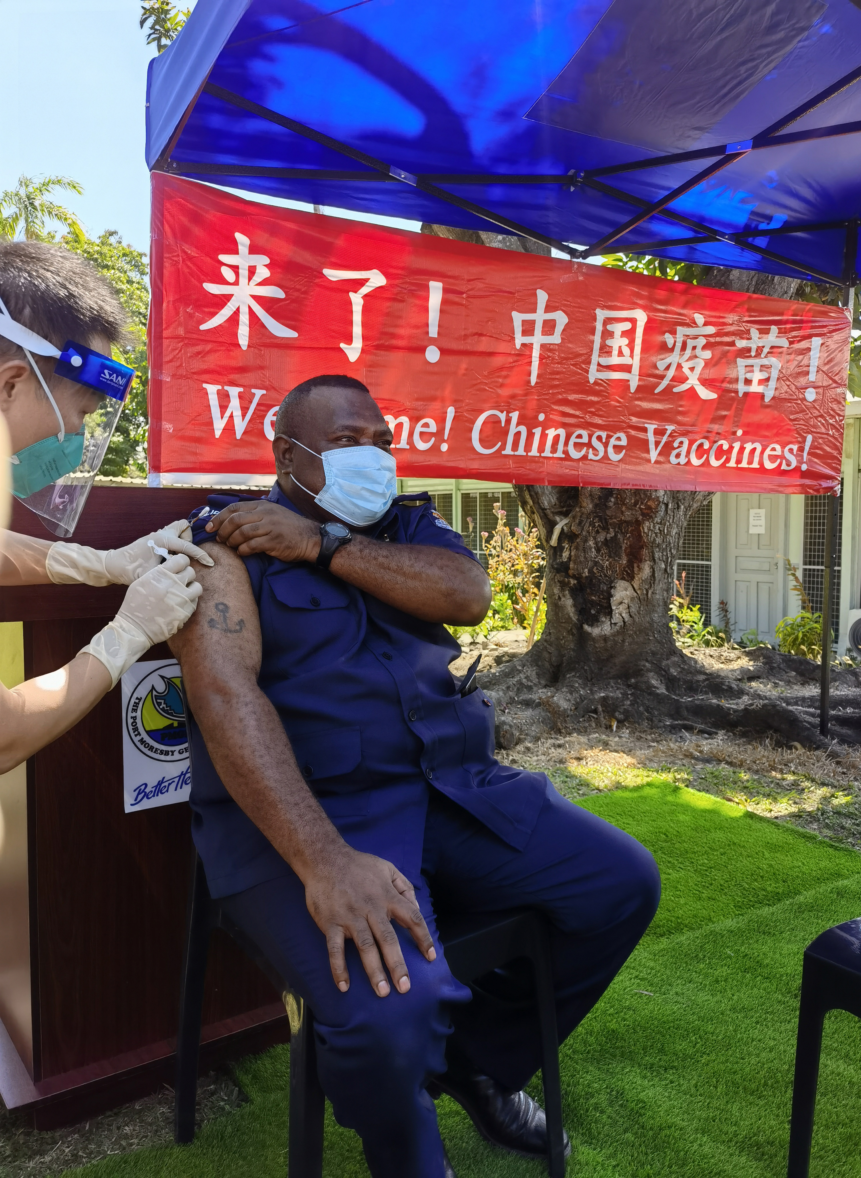 巴布亚新几内亚政府2021年7月13日在首都莫尔兹比港总医院正式开始为当地民众接种中国疫苗。图为7月13日,一名男子接种中国疫苗。新华社发(中国驻巴新大使馆供图)