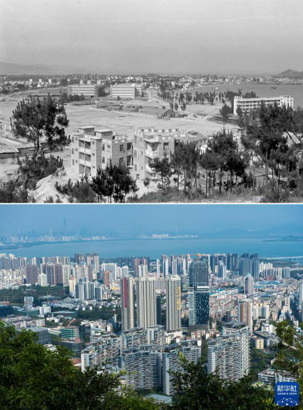上图为深圳蛇口工业区一瞥(1982年8月3日发,新华社记者李长永摄);下图为广东自贸区深圳前海蛇口片区内的蛇口片区(2015年2月26日,新华社记者毛思倩摄)。