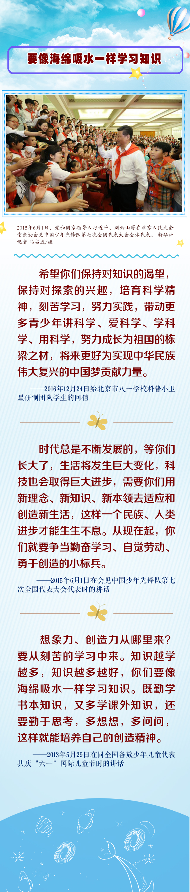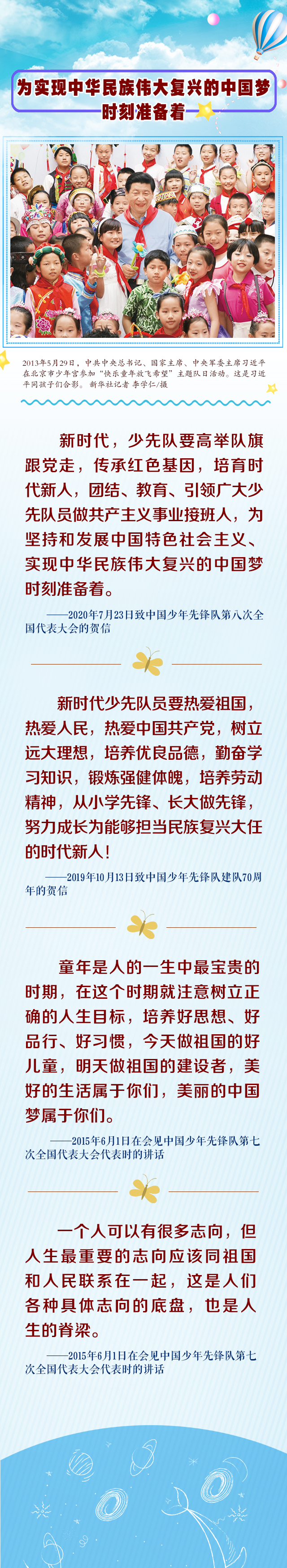 编者按:“孩子们成长得更好,是我们最大的心愿。”少年儿童的健康成长和全面发展,是习近平总书记心中最温暖的牵挂。党的十八大以来,习近平总书记高度重视中国少年先锋队建设、亲切关怀少年儿童健康成长,寄语广大少年儿童刻苦学习知识,坚定理想信念,磨练坚强意志,锻炼强健体魄,为实现中华民族伟大复兴的中国梦时刻准备着。在“六一”国际儿童节到来之际,我们梳理了习近平总书记对少年儿童的殷殷寄语,一起来学习。