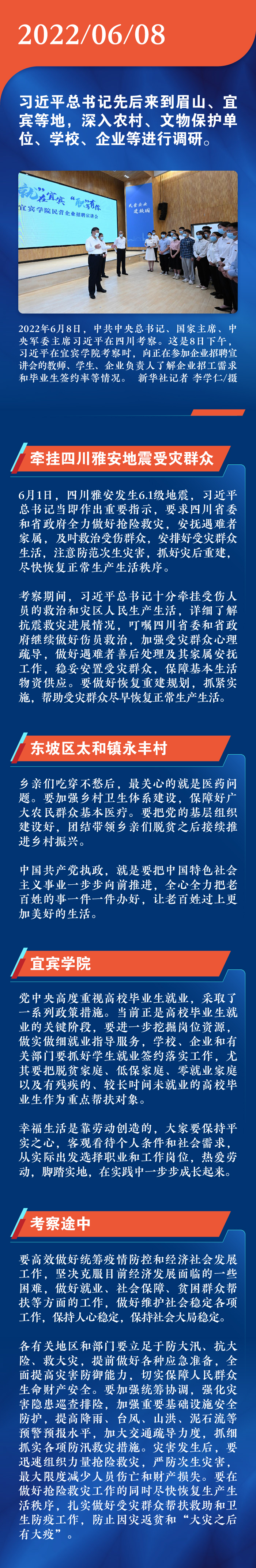 2022年6月8日,习近平总书记来到四川眉山、宜宾等地,深入农村、文物保护单位、学校、企业等进行调研,为推动治蜀兴川再上新台阶指引方向,为谱写四川发展新篇章擘画蓝图。