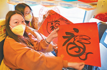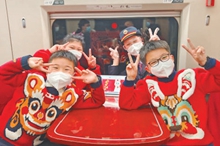 林海雪原苍茫无际,一抹亮绿游走其间。列车车厢里人头攒动、暖意融融,轻轻摇曳的红灯笼、中国结,透着浓浓的“年味儿”。