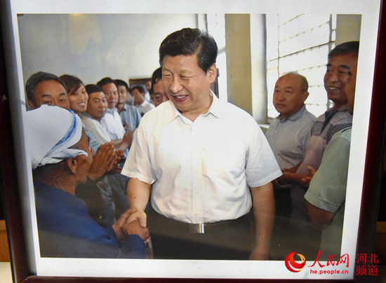 图为2013年习近平总书记在平山县西柏坡革命旧址同闫青海握手交谈。(翻拍于闫青海家相框中照片。付兆飒 拍摄)