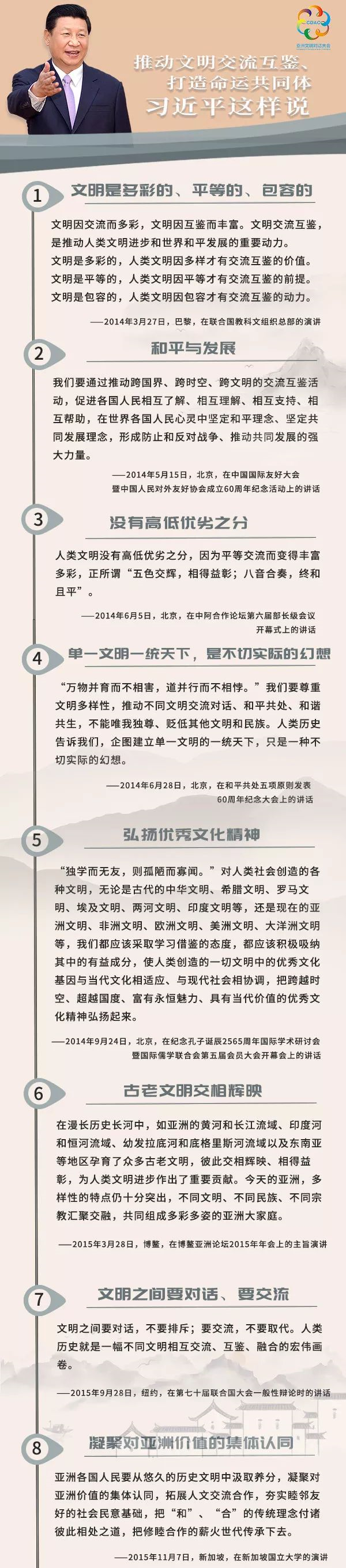 亚洲文明对话大会将于5月15日在北京开幕。围绕“亚洲文明交流互鉴与命运共同体”主题,大会将为亚洲文明互学互鉴、繁荣发展搭建平台。关于文明交流互鉴,习近平主席有过哪些精辟论述?让我们一起聆听。