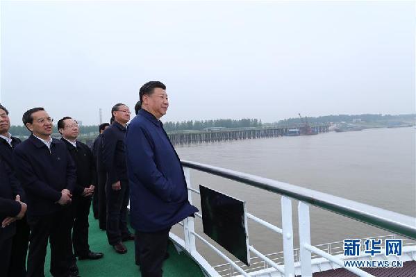 4月25日上午,习近平乘船沿长江察看两岸生态环境和发展建设情况(图自新华网)