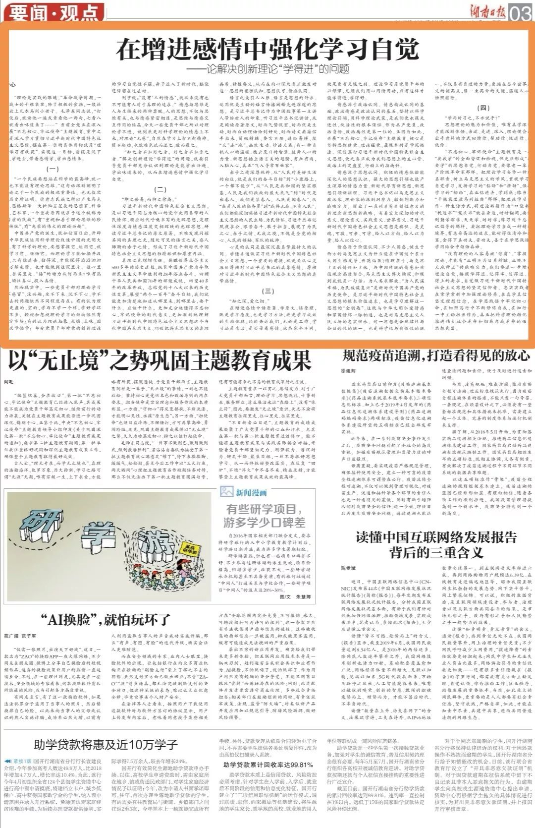 当前全党正在深入开展“不忘初心、牢记使命”主题教育,重中之重是深入学习贯彻习近平新时代中国特色社会主义思想。湖南日报今天刊登了一篇题为《在增进感情中强化学习自觉》的文章,与大家谈谈如何解决创新理论“学得进”的问题。文章认为,要实现“理论学习有收获”这一目标,前提是沉下心、学进去,带着感情学、学出感情来。具体怎么做?作者认为:一要引导党员干部充分认识到理论是能学出兴趣、学出味道来的,从而在增进感情中强化学习自觉;二要从心灵深处厚植对习近平总书记的真挚感情,厚植对习近平新时代中国特色社会主义思想的真挚感情;三要以政治认同、思想认同、价值认同增进情感,用心用情用功学习理论知识;四要把理论学习当作一种神圣职责、一种生活方式、一种精神境界,形成“我要学”的思想自觉、行动自觉。