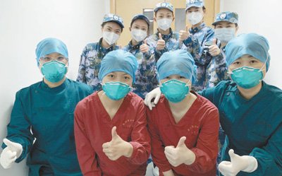 医护人员交接班,为自己加油鼓劲。 王震宇摄