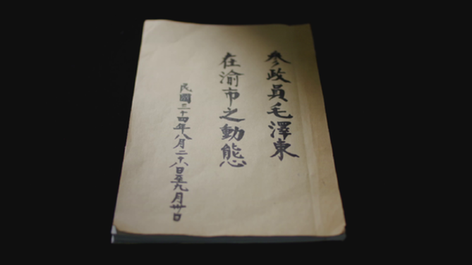 这份文物《参政员毛泽东在渝市之动态》最初不在我们馆,我们是通过拍卖公司购买回来的。这份材料一共有46页,是在国民党宪兵司令张镇的亲自指挥和安排下,司令部的一些宪兵和便衣全程对毛泽东主席从8月28日到重庆一直到9月30日整个行程的记录。