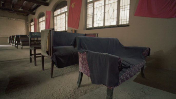 会场前面放置的长条椅是当年的原物,长条椅的数量很少,只有两个,还有四个沙发。这四个沙发也是在战场上缴获的战利品。参会的代表中,中央委员34位,中央候补委员19位,还有11位列席人员,总共64位代表。他们当时是怎么坐呢?没有固定位置。到会早、年龄长的代表,前面的沙发、长条椅随便坐,来的晚的领导都是自带小板凳、小马扎,有的领导带着帆布躺椅来开会。在九天的会议期间,代表们每天坐的位置都是不一样的。