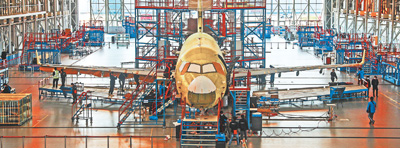 3月6日,工人在中国商飞上海飞机制造有限公司的生产车间内作业。新华社记者 丁汀摄