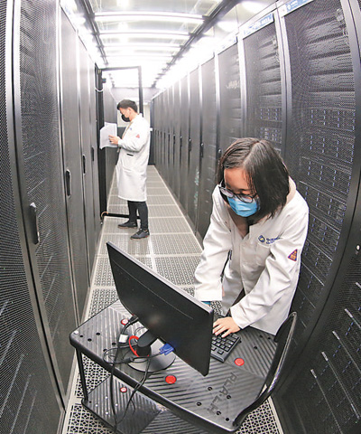 3月24日,中国移动(襄阳)数据中心,网络工程师在新型绿色仓储式数据中心进行网络调试。王虎摄(人民视觉)