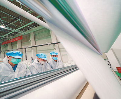 4月23日,燕山石化工人正在熔喷无纺布生产线上工作,该生产线仅用时12天就建成投产。人民日报记者 贺 勇摄