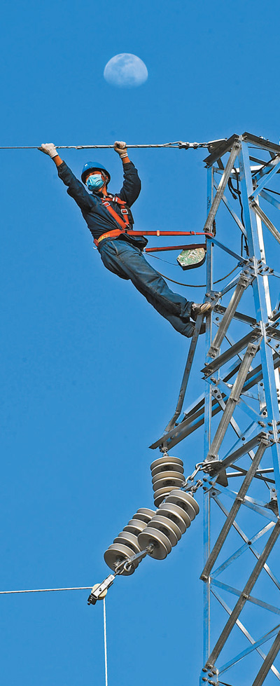 4月4日,在安徽省亳州市谯城区,国网亳州供电公司电力工人正在架设输电线路。张延林摄(影像中国)