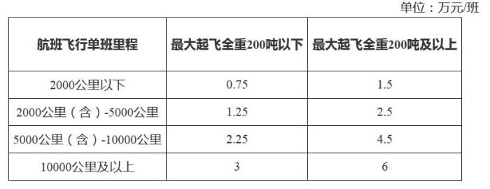对疫情防控期间执飞的不载客国际货运航班给予奖励,奖励标准按航班飞行里程和最大起飞全重分为八档,具体标准为: