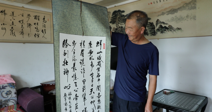 “鸟语催人醒,蛙音伴梦乡,小河绕田野,青山披盛装。虽不比蓬莱,仍可算一方。”贵州省遵义市播州区花茂村村民侯光富把自己这些年的心声编成了一首诗,写在宣纸上,裱起来挂在家里的客厅中央。63岁的侯光富是花茂村小学退休教师,在他看来,诗中场景是他理想的小康生活。这是侯光富在向记者展示另一幅字。见习记者张诗童摄
