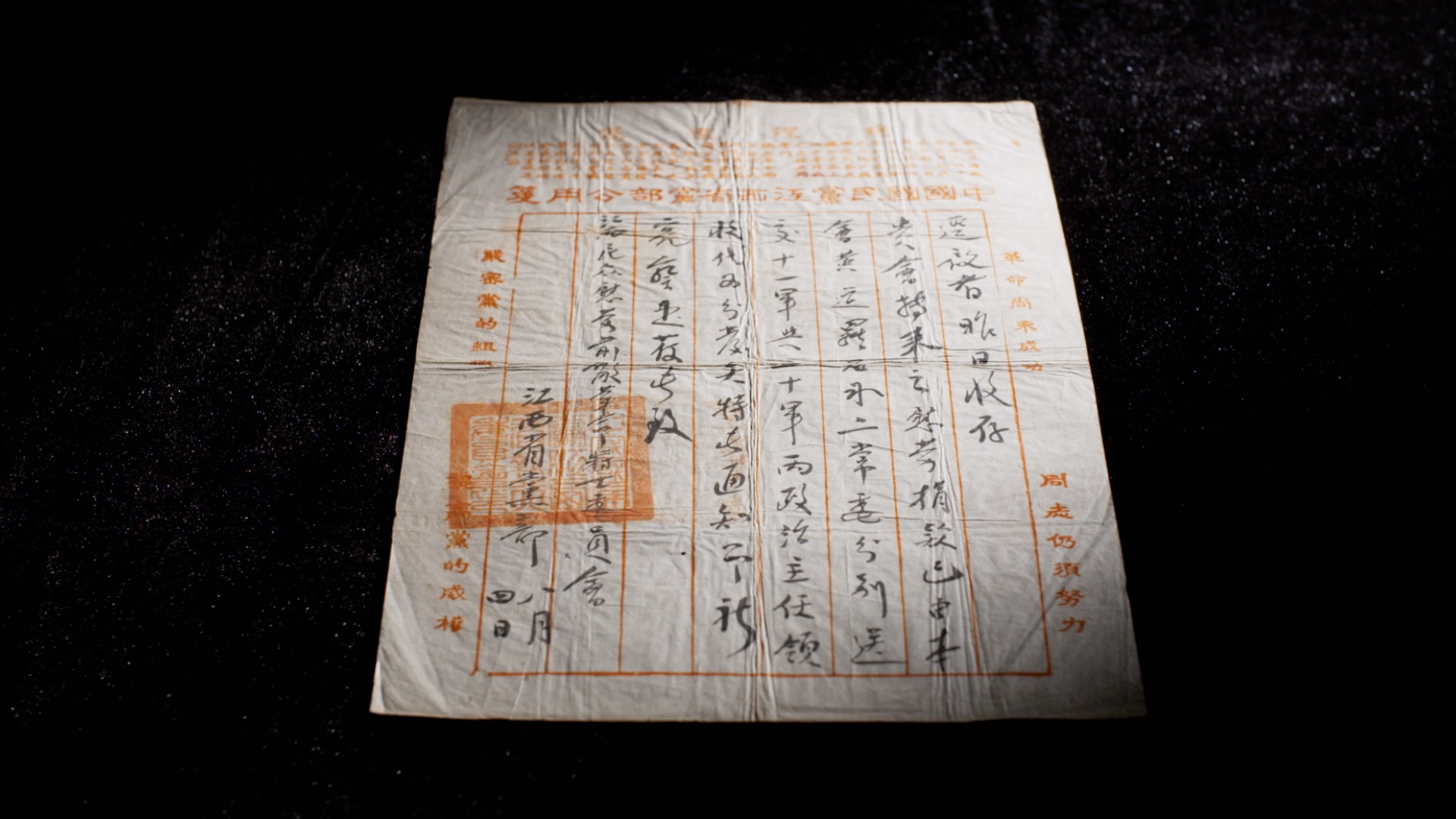 刘小花(南昌八一起义纪念馆 陈列保管部主任):这两件文物是当时江西民众慰劳起义军将士捐款的收条和回信,是1958年5月入藏到我馆的,现在是国家一级文物。这两件文物采用的是统一印刷的公文信笺,为“明八行”信纸,信笺的最上端有总理遗嘱,往下就是“中国国民党党部公用笺”几个字。
