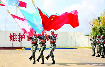 这是二○一六年五月二十三日,在黎巴嫩南部辛尼亚村,中国赴黎巴嫩维和部队士兵举着中国国旗、联合国旗帜和黎巴嫩国旗参加中国第十五批与第十四批赴黎巴嫩维和部队的轮换交接仪式。新华社发
