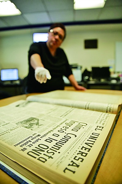 2019年9月9日,墨西哥《宇宙报》阅览室员工介绍当年中国重返联合国的相关报道。新华社发