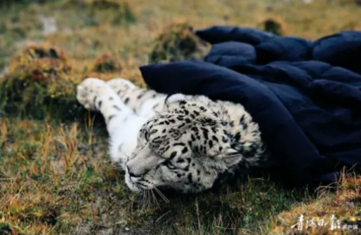 救助后休憩的雪豹。