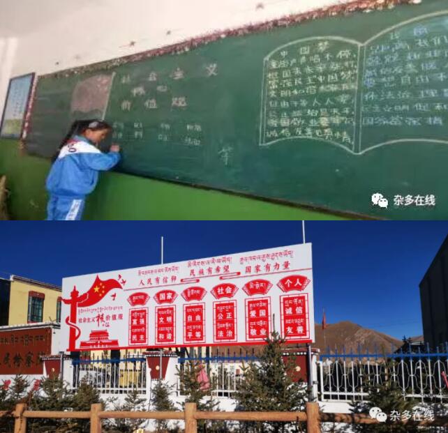 “富强、民主、文明、和谐……”杂多县一完小每周一节的思政教育课上,孩子们齐声朗诵着社会主义核心价值观24字内容。广场、巷道、楼宇、校园、社区,一幅幅精美的社会主义核心价值观公益广告跃入眼帘,春风化雨,润物无声。