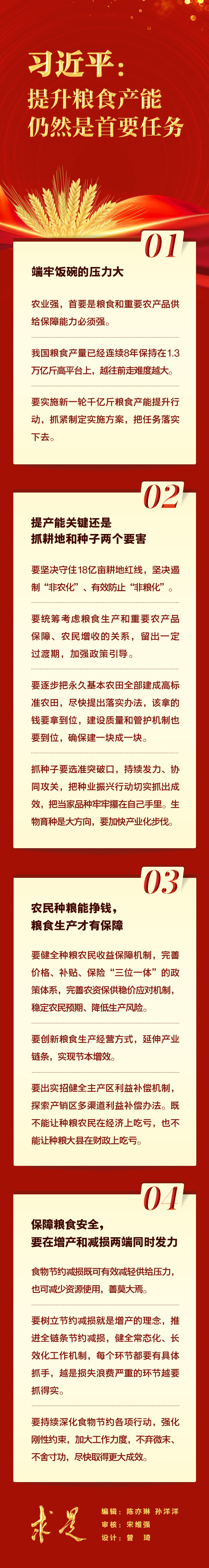 在2023年第6期《求是》杂志刊发的习近平总书记重要文章《加快建设农业强国 推进农业农村现代化》中,总书记再次强调指出,“保障粮食和重要农产品稳定安全供给始终是建设农业强国的头等大事”,“提升粮食产能仍然是首要任务”。