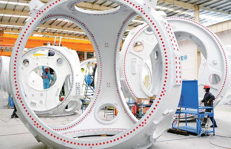 一季度,我国产业链供应链加快修复,促进工业经济平稳增长的政策举措持续落地见效,工业生产增速回升。图为2023年4月20日,在山东省惠民县风电装备制造产业园涂装车间,工人在涂装风电轮毂。 新华社记者 郭绪雷/摄