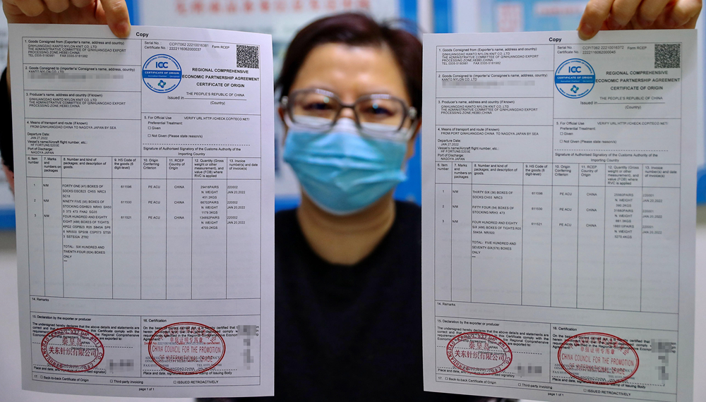 中国贸促会助力建设面向全球的高标准自贸区网络,高质量实施《区域全面经济伙伴关系协定》(RCEP)等自贸协定。图为2022年1月28日,河北省秦皇岛市贸促会工作人员展示该单位签发的首份RCEP原产地证书。人民图片 曹建雄/摄