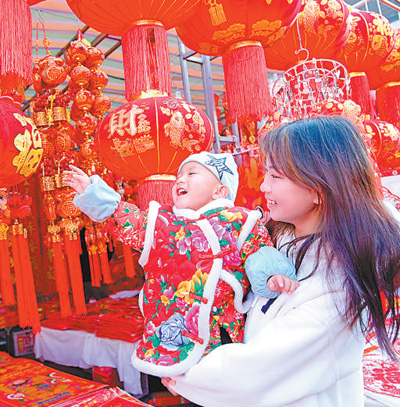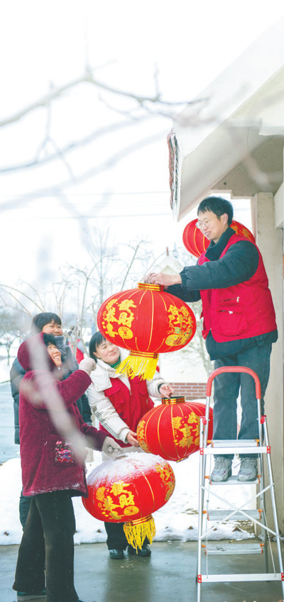 江苏省宿迁市,志愿者在帮当地村民挂灯笼。
