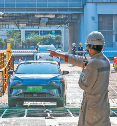 车辆正在有序登船。