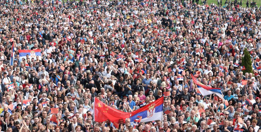 5月8日稍早时候,在贝尔格莱德的塞尔维亚大厦广场上,从各地赶来的近2万名民众翘首等待。当习近平主席在塞尔维亚总统武契奇陪同下来到大厦平台,向人群挥手致意时,现场欢呼声、掌声雷鸣般响起,表示最热烈的欢迎。